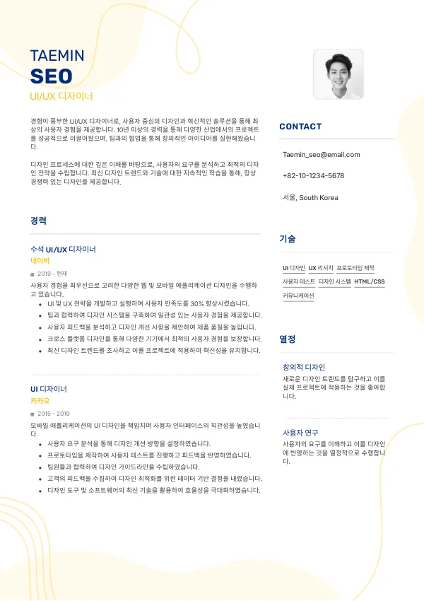 - 전통적인 이력서 형식을 따르세요. 단순하고 명확하게 정보를 제시하세요.