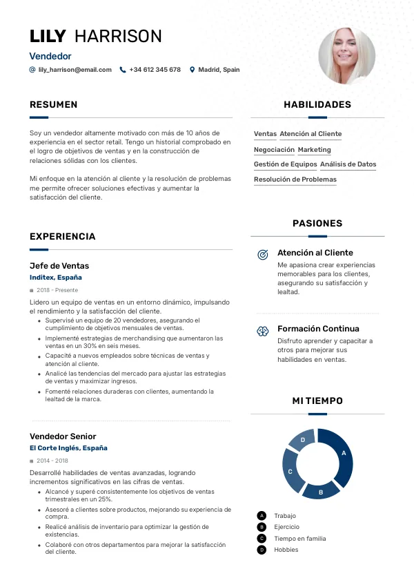- Mejor: Un resumen claro de tus habilidades y logros en ventas.