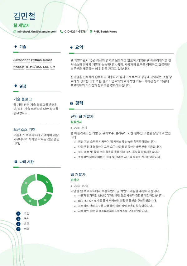 - 더 나은 포맷: 통일된 글꼴과 색상으로 깔끔하게 정리된 이력서.