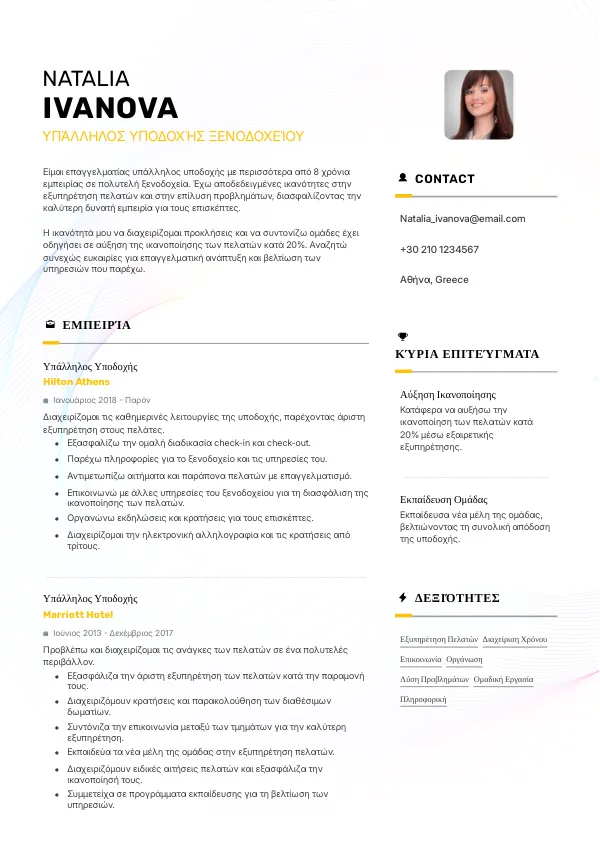 - Καλύτερο: Επαγγελματική εμπειρία στην εξυπηρέτηση πελατών σε ξενοδοχειακό περιβάλλον.